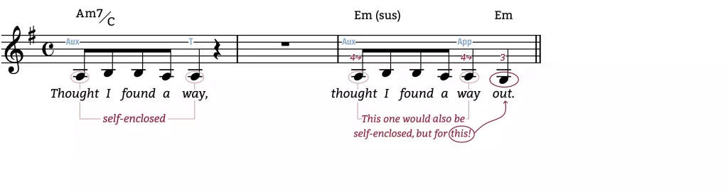 The first and last notes of an Auxiliary figure match. That might not seem significant; but it is here. See, depending on the rhythm, moving away then returning to the same note can create a sense of closure (finality). And here, Eilish puts her first and last notes come on strong beats: the perfect recipe for closure using an Auxiliary figure.
