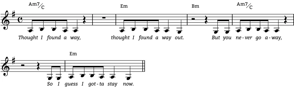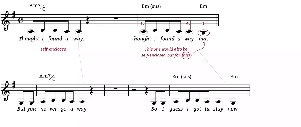 [2] In this second gesture, Eilish adds a word! (The word “out.”) And this new word is given A NEW NOTE—(G)—an escape route from the dead end Auxiliary figure. And at the same time, that G resolves the harmonic tension of the melody’s sus note: A moving to G (4→3). In this way, the harmonic resolution at the end together with the new note signals hope.